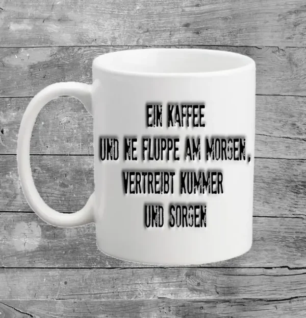 “Diese stylische weiße Tasse ist der perfekte Start in den Tag! Mit dem spritzigen Spruch: ‚Ein Kaffee und eine Fluppe am Morgen vertreiben Kummer und Sorgen‘ und einem coolen Design wird sie zum idealen Begleiter für den morgendlichen Genuss. Ein echtes Must-have für alle, die ihren Tag mit einem Lächeln beginnen wollen!”