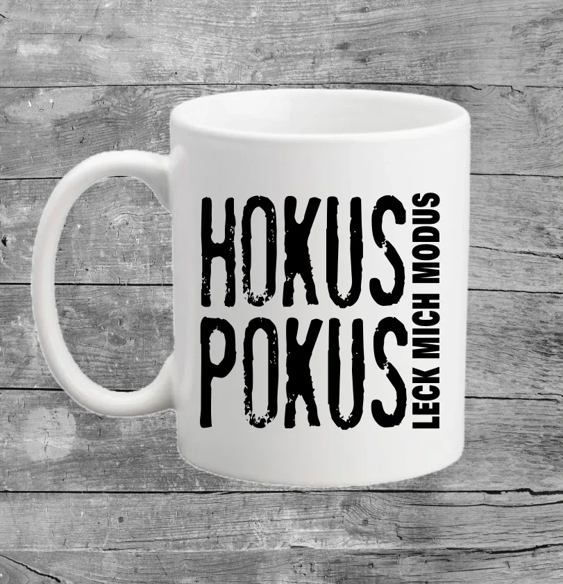 “Diese coole weiße Tasse bringt mit dem Spruch ‚Hokus Pokus, Leck mich Modus‘ garantiert ein Lächeln in den Alltag! Perfekt für alle, die ihren Kaffee mit einer Prise Humor und einer ordentlichen Portion Frechheit genießen möchten. Ein echter Hingucker und ein bisschen Magie für den Morgen!”